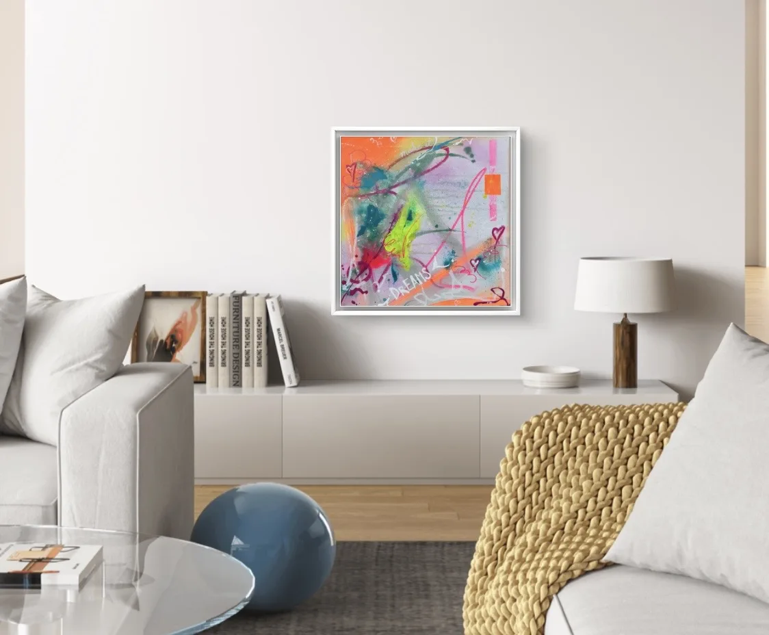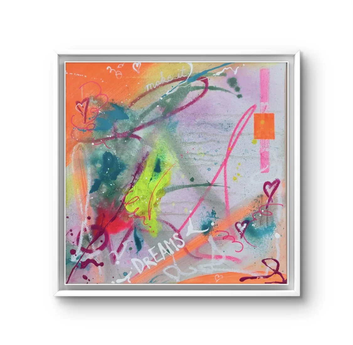 Farben überlagern sich in lebendigen Schichten.Spuren und Linien durchziehen die Oberfläche wie Gedanken im Fluss. Neonakzente treffen auf sanfte Übergänge, Fragmente und Zeichen wirken wie flüchtige Erinnerungen. Das Wort „Dreams“ taucht nicht zufällig auf – es steht für die Vielschichtigkeit innerer Bilder, für Sehnsucht, Bewegung und das Ungeordnete, das dennoch eine eigene Harmonie findet.